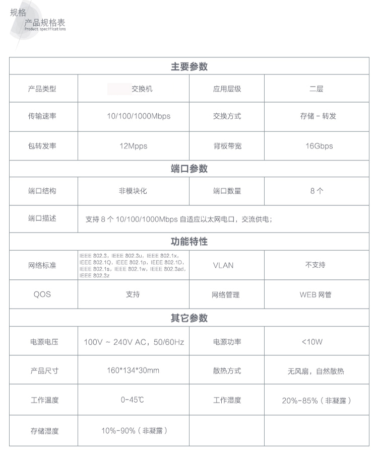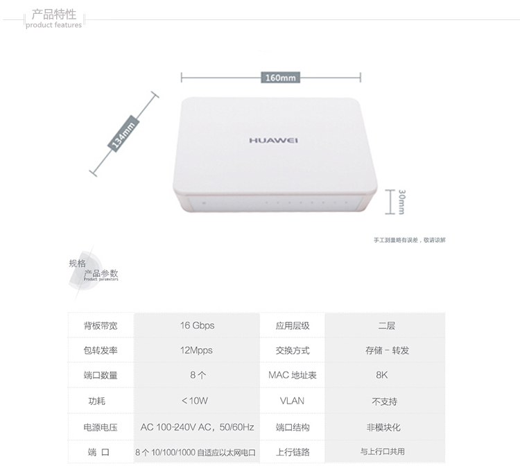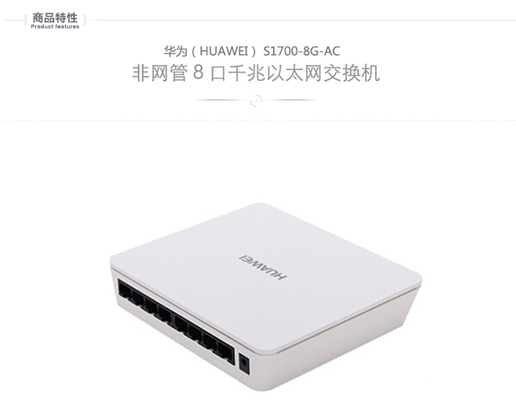 商品名称:华为(HUAWEI) S1700-8G-AC 桌面式非网管交换机 8个10/100/1000Base-T以太网端口 交流供电一年保修